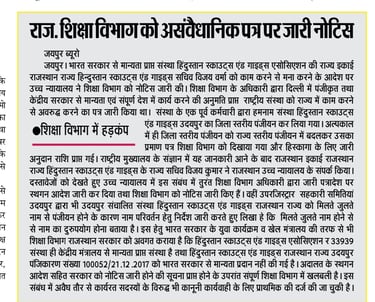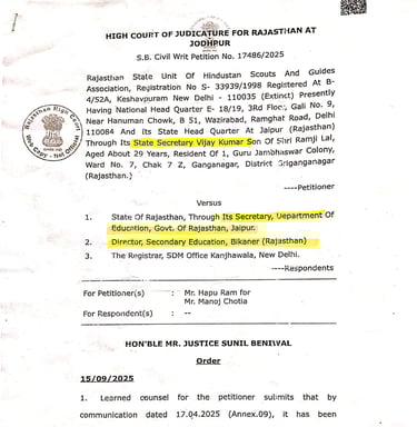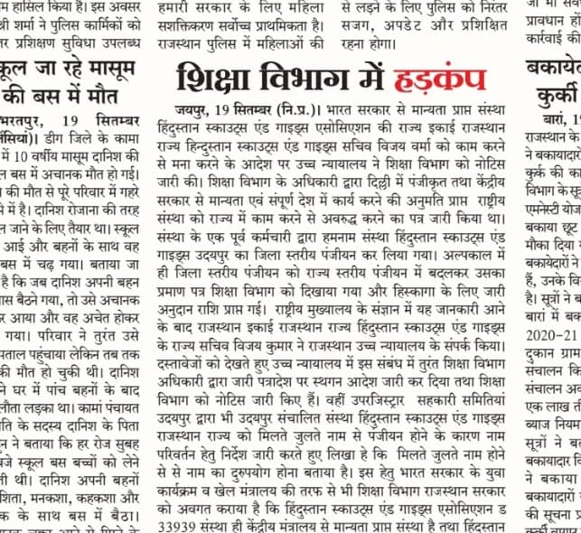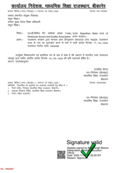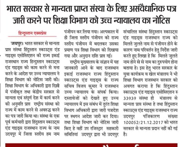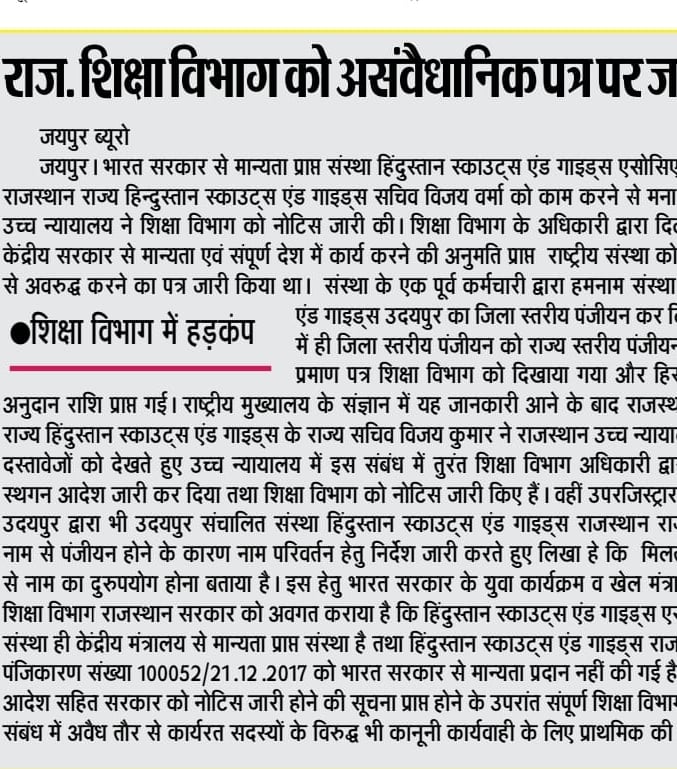 निदेशक माध्यमिक शिक्षा बीकानेर ने समस्त सम्भगीय आयुक्त व मुख्य जिला शिक्षा अधिकारियो को आदेश जारी करते हुए लिखा हे की राजस्थान उच्च न्यायालय के आदेश हिन्दुस्तान स्काउट्स एंड गाइड्स एसोसिएशन की मान्यता के समंध में जारी किये गए है तथा आदेश की प्रति सलग्न कर लेख आदेशित किया जाता हे की उच्च न्यायालय के आदेशों की पलना सुनिश्चित की जाए |