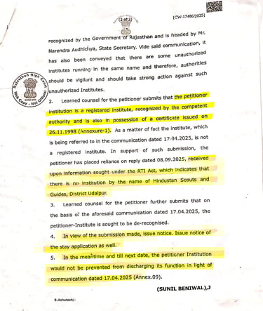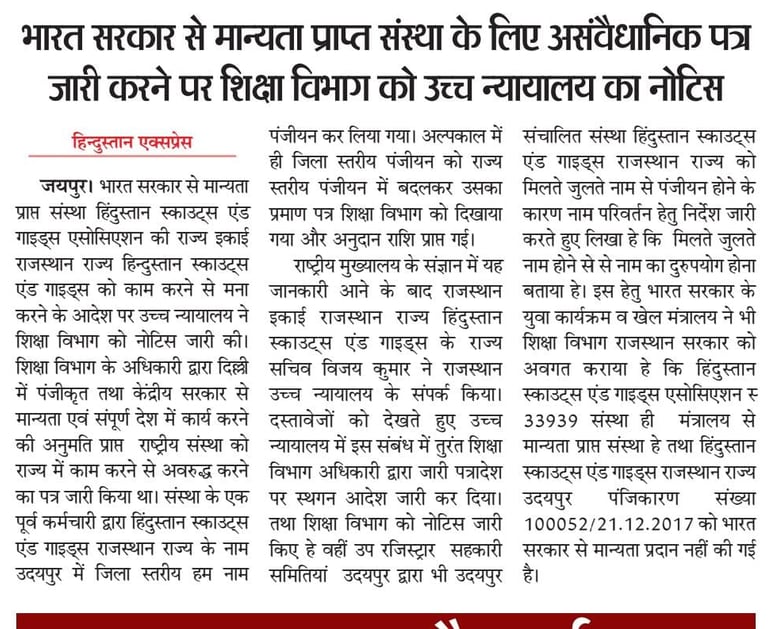 राजस्थान हाई कोर्ट जोधपुर द्वारा राजस्थान शिक्षा विभाग को तारीख 15-09-2025 को आदेश जारी कर स्पस्ट किया गया की हिंदुस्तान स्काउट्स एंड गाइड्स एसोसिएशन की राज्य राजस्थान राज्य हिन्दुस्तान स्काउट्स एंड गाइड्स एक पंजीकृत और मान्यता प्राप्त संस्था है तथा उदयपुर संचलित हमनाम व फर्जी हिंदुस्तान स्काउट्स एंड गाइड्स राजस्थान राज्य पंजीकरण संख्या 100052 संस्था जिसका 2017 में पंजीकरण करवाकर संचलित किया जा रहा है वह संस्था एक गैरमान्यता प्राप्त संस्था है