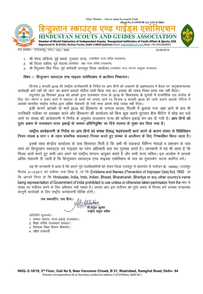 राजस्थान राज्य में हिन्दुस्तान स्काउट्स एंड गाइड्स एसोसिएशन को स्काउट्स एंड गाइड्स गतिविधिया संचलन की अनुमति वर्ष 2015 में शिक्षा विभाग द्वारा भारत सरकार के युवा कार्यक्रम एवं खेल मंत्रालय के पत्र दिनांक 26-09-2013 जो की हिन्दुस्तान स्काउट्स एंड गाइड्स एसोसिएशन दिल्ली के नाम से जारी पत्र को आधार मानकर दी गई तत्कालीन कार्यकारणी के पास कोई अन्य कार्यालय न होने के कारण राज्य मुख्यलय का संचालन उदयपुर के एक आवास स्थान से किया जा रहा था किन्तु तत्कालीन राज्य सचिव की कदाचार व लालची मानसिकता के चलते तत्कालीन राज्य सचिव व उनके सहियोगी सहयक राज्य सचिव व राज्य संगठन आयुक्त को आजीवन संस्था से निष्कासीत कर दिया गया जिसके बाद निष्कासित व लालची लोगो ने मिलकर हमनाम संस्था का पंजीकरण करवाकर राजस्थान राज्य में हिन्दुस्तान स्काउट्स के नाम का दुरूपयोग करना शुरू किया जब राष्ट्रीय मुख्यालय को फर्जी संस्था के लगातार संशलन की खबर लगी तो राष्ट्रीय मुख्यालय द्वारा नए राज्य सचिव( श्री विजय कुमार ) की न्युक्ति की गई जिसके बाद नविन राज्य कार्यकरणी का गठन किया गया और फर्जी संस्था जो उदयपुर से संचलन किया जा रहा था उसके खिलाफ कारवाही शुरू की गई |